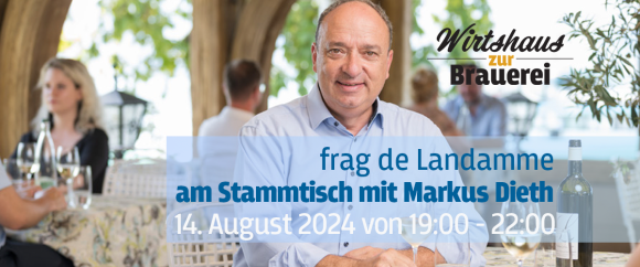 Alle Aargauerinnen und Aargauer sind herzlich eingeladen, am diesjährigen Landammann-Stammtisch mit Landammann und Finanzdirektor Markus Dieth teilzunehmen. Der Stammtisch findet am 14. August im Wirtshaus zur Brauerei in Villmergen statt und bietet eine ungezwungene Atmosphäre für offenen Austausch, Diskussion und politische Gespräche.